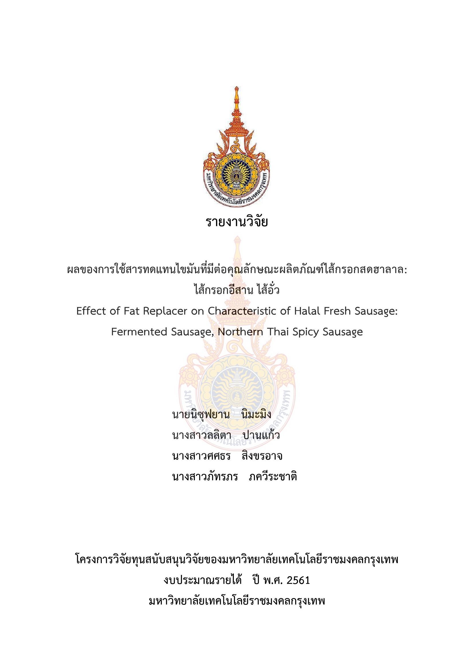 ผลของการใช้สารทดแทนไขมันที่มีต่อคุณลักษณะผลิตภัณฑ์ไส้กรอกสดฮาลาล:ไส้กรอกอีสาน ไส้อั่ว