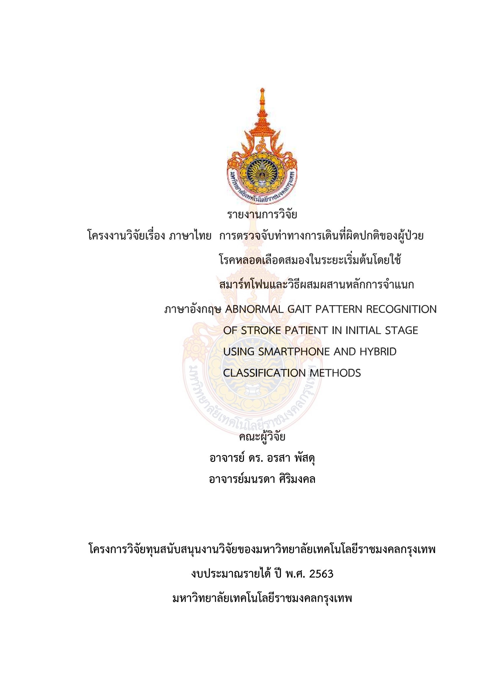 การตรวจจับท่าทางการเดินที่ผิดปกติของผู้ป่วยโรคหลอดเลือดสมองในระยะเริ่มต้นโดยใช้สมาร์ทโฟนและวิธีผสมผสานหลักการจำแนก