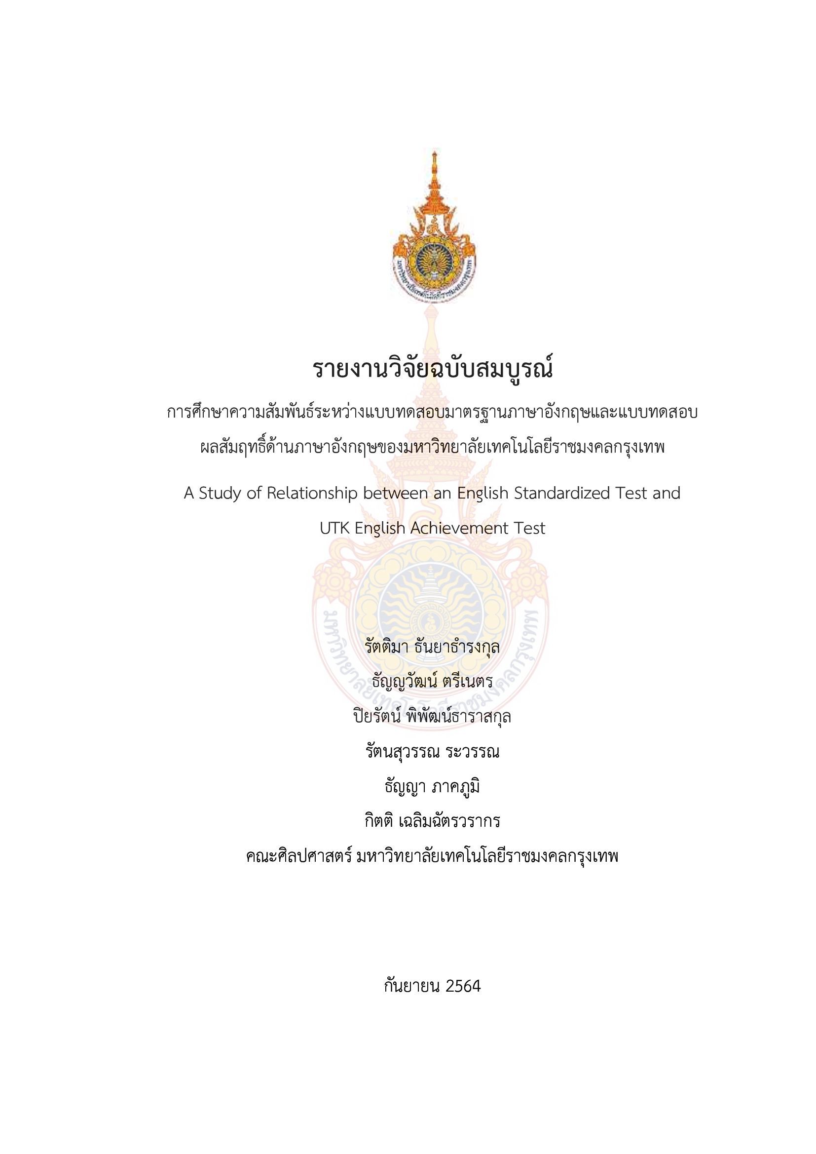 เนื้อหาย่อ : การศึกษาครั้งนี้มีจุดมุ่งหมายเพื่อ เพื่อ 1) ศึกษาความสัมพันธ์ของคะแนนของแบบทดสอบ ภาษาอังกฤษเพื่อการสื่อสารนานาชาติ (TOEIC) และ คะแนนแบบทดสอบวัดวัดผลสัมฤทธิ์ด้าน ภาษาอังกฤษของมหาวิทยาลัยเทคโนโลยีราชมงคลกรุงเทพ (UTK Test) และ 2) เพื่อศึกษาระดับ ความสามารถด้านภาษาอังกฤษของนักศึกษาชั้นปีที่ 4 มหาวิทยาลัยเทคโนโลยีราชมงคลกรุงเทพ กลุ่ม ตัวอย่างที่ใช้ในการวิจัยเป็นนักศึกษาชั้นปีที่ 4 คณะศิลปศาสตร์ มหาวิทยาลัยเทคโนโลยีราชมงคล กรุงเทพ ภาคการศึกษาที่ 2 ปีการศึกษา 2563 จำนวน 100 คน โดยวิธีสุ่มตัวอย่างแบบเฉพาะเจาะจง เครื่องมือที่ใช้ในการรวบรวมข้อมูล คือ แบบทดสอบภาษาอังกฤษเพื่อการสื่อสารนานาชาติ (TOEIC) และ แบบทดสอบวัดวัดผลสัมฤทธิ์ด้านภาษาอังกฤษของมหาวิทยาลัยเทคโนโลยีราชมงคลกรุงเทพ (UTK Test) ที่ผู้วิจัยสร้างขึ้น วิเคราะห์ข้อมูลโดยการหาค่าเฉลี่ย ค่าร้อยละ ส่วนเบี่ยงเบนมาตรฐาน ของข้อสอบทั้งสองฉบับ จากนั้นนำคะแนนที่ได้จากการทำแบบทดสอบทั้งสองฉบับมาหาค่า สัมประสิทธิ์สหสัมพันธ์ของเพียร์สัน