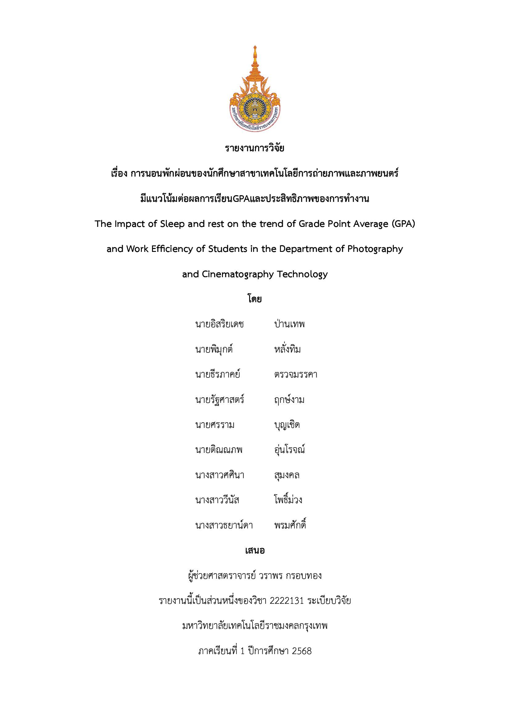 การนอนพักผ่อนของนักศึกษาสาขาเทคโนโลยีการถ่ายภาพและภาพยนตร์มีแนวโน้มต่อผลการเรียนGPAและประสิทธิภาพของการทำงาน