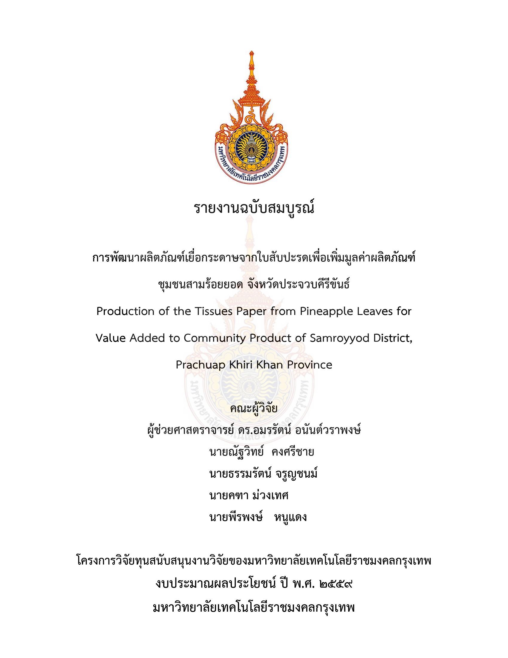 การพัฒนาผลิตภัณฑ์เยื่อกระดาษจากใบสับปะรดเพื่อเพิ่มมูลค่าผลิตภัณฑ์ชุมชนสามร้อยยอด จังหวัดประจวบคีรีขันธ์