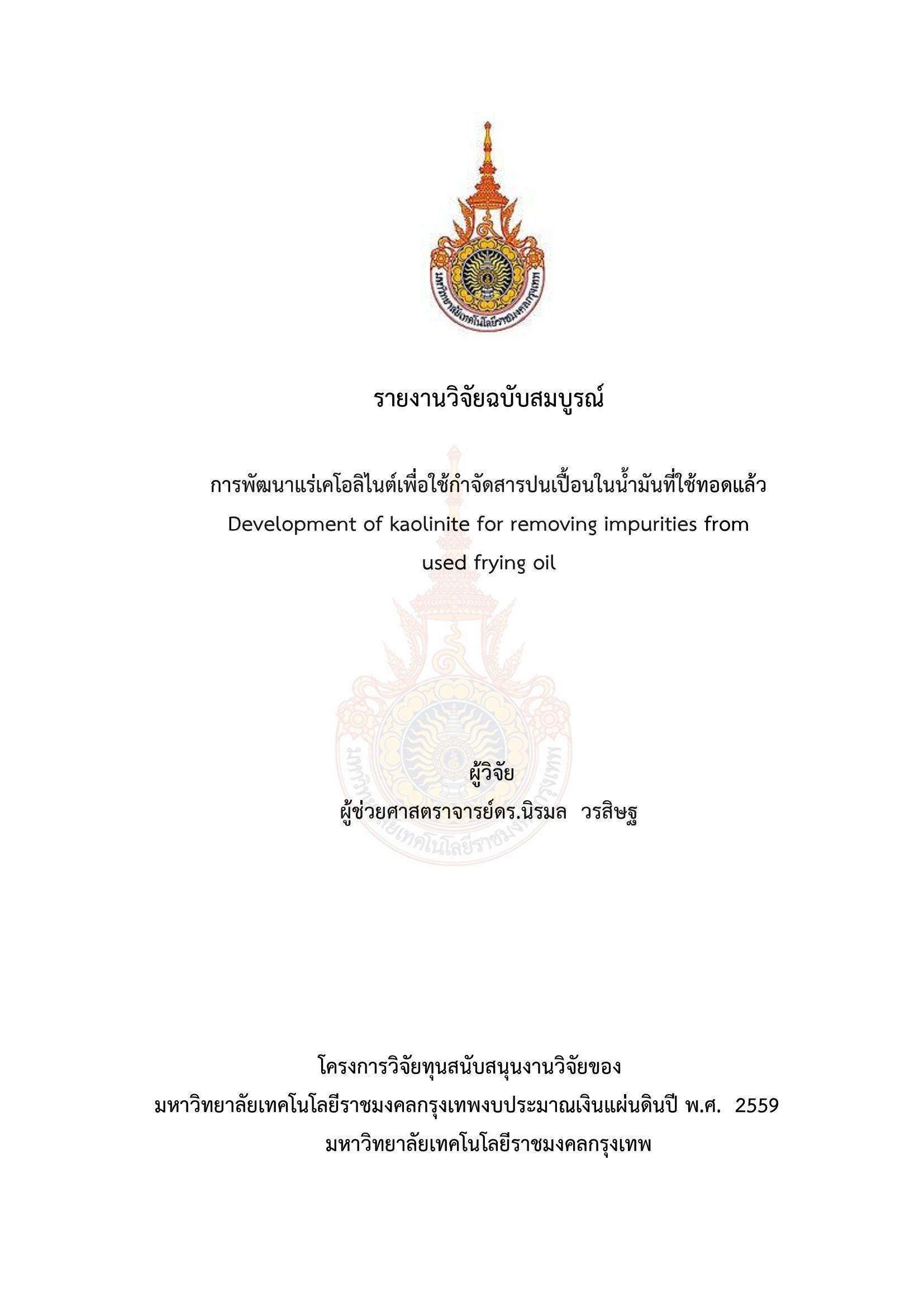 การพัฒนาแร่เคโอลิไนต์เพื่อใช้กำจัดสารปนเปื้อนในน้ำมันที่ใช้ทอดแล้ว